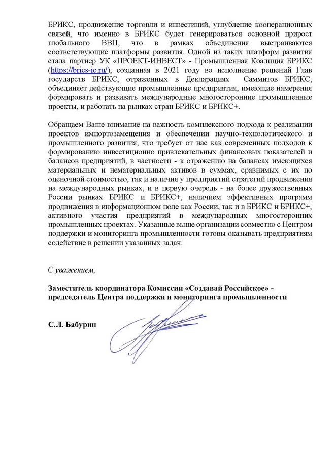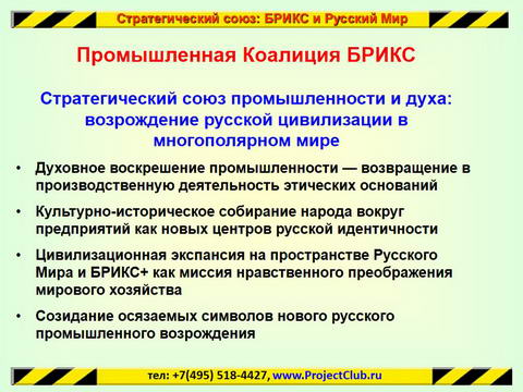 20 ноября 2025 года в здании Государственной Думы ФС РФ было подписано Соглашение о сотрудничестве между Промышленной Коалицией БРИКС, представленной в лице ООО «Клуб Проектного Процесса» ( https://www.projectclub.ru/BRICS-IC-01.htm ), Комиссией по импортозамещению и технологическому лидерству Федерального проекта партии ЕДИНАЯ РОССИЯ "Выбирай своё", комиссии «Создавай Российское» («Технологический суверенитет»), представленной в лице АНО "Центр поддержки и мониторинга промышленности" ( https://anocpmp.ru/ ), и ООО Управляющая компания "Проект-Инвест" ( https://www.proect-invest.ru/ ).