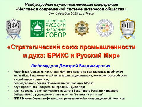 Экономист, сопредседатель Совета Промышленной Коалиции БРИКС Дмитрий Владимирович Любомудров сделал доклад на тему: «Вклад экономической этики в идеологию».