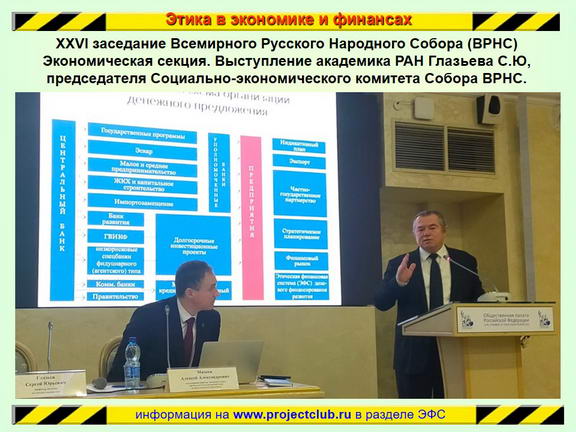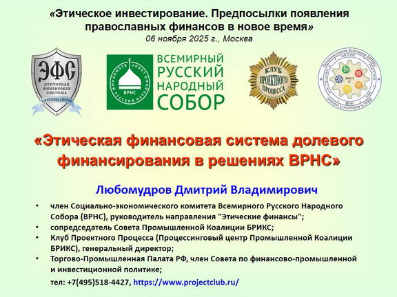 18. Программа опережающего социально-экономического развития России «Социальная справедливость и экономический рост», Раздел 5. Создание макроэкономических условий опережающего развития экономики, пункт 5.1. Нормализация денежного обращения: Целесообразно также создать Этическую финансовую систему (ЭФС), основанную на Своде нравственных принципов и правил в хозяйствовании, принятом в 2004 году на VIII Всемирном Русском Народном Соборе. В качестве первого шага внедрения проекта может быть предложено создание функциональных элементов ЭФС, в частности – фондов долевого финансирования различного назначения, в том числе Фондов православных предпринимателей.
