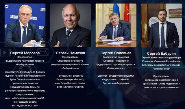 Председателем Общественного совета ФПП «Выбирай свое» является Чемезов Сергей Викторович, Герой Российской Федерации, Генеральный директор Государственной корпорации «РОСТЕХ», Председатель Общероссийской общественной организации «Союз машиностроителей России», член Бюро Высшего совета партии «ЕДИНАЯ РОССИЯ». Первые несколько предприятий, направленные АНО "Центр поддержки и мониторинга промышленности" Управляющей компании "Проект-Инвест" для капитализации, уже увеличили свой уставной капитал и готовятся к началу финансирования. Результаты формирования групп таких предприятий Стороны планируют представить на крупных промышленных федеральных и международных выставках и площадках.