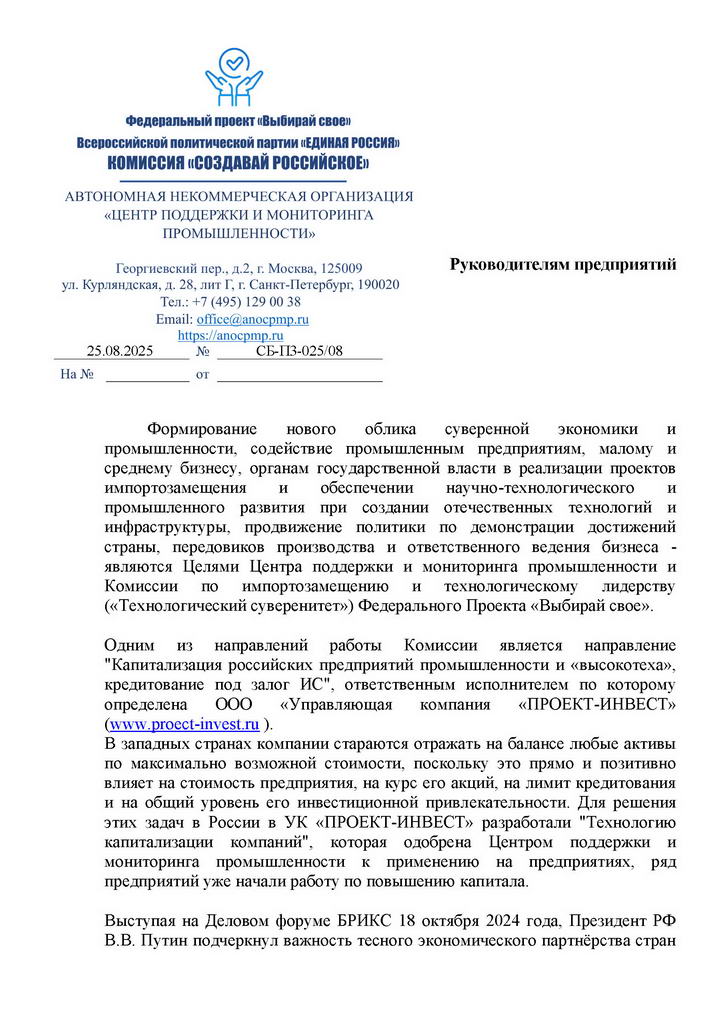 Автономная некоммерческая организация по содействию реализации проектов импортозамещения и технологического суверенитета "Центр поддержки и мониторинга промышленности" ( https://anocpmp.ru/ ) включает 89 территориальных представителей и отраслевых экспертов, осуществляет комплекс специальных взаимоувязанных мероприятий, направленных на формирование уникального протекционистского законодательства для производства и продвижения Российской промышленной продукции, а также осуществляет практическую поддержку промышленных предприятий-участников Проекта. Комиссия по импортозамещению и технологическому лидерству ФПП "Выбирай свое":